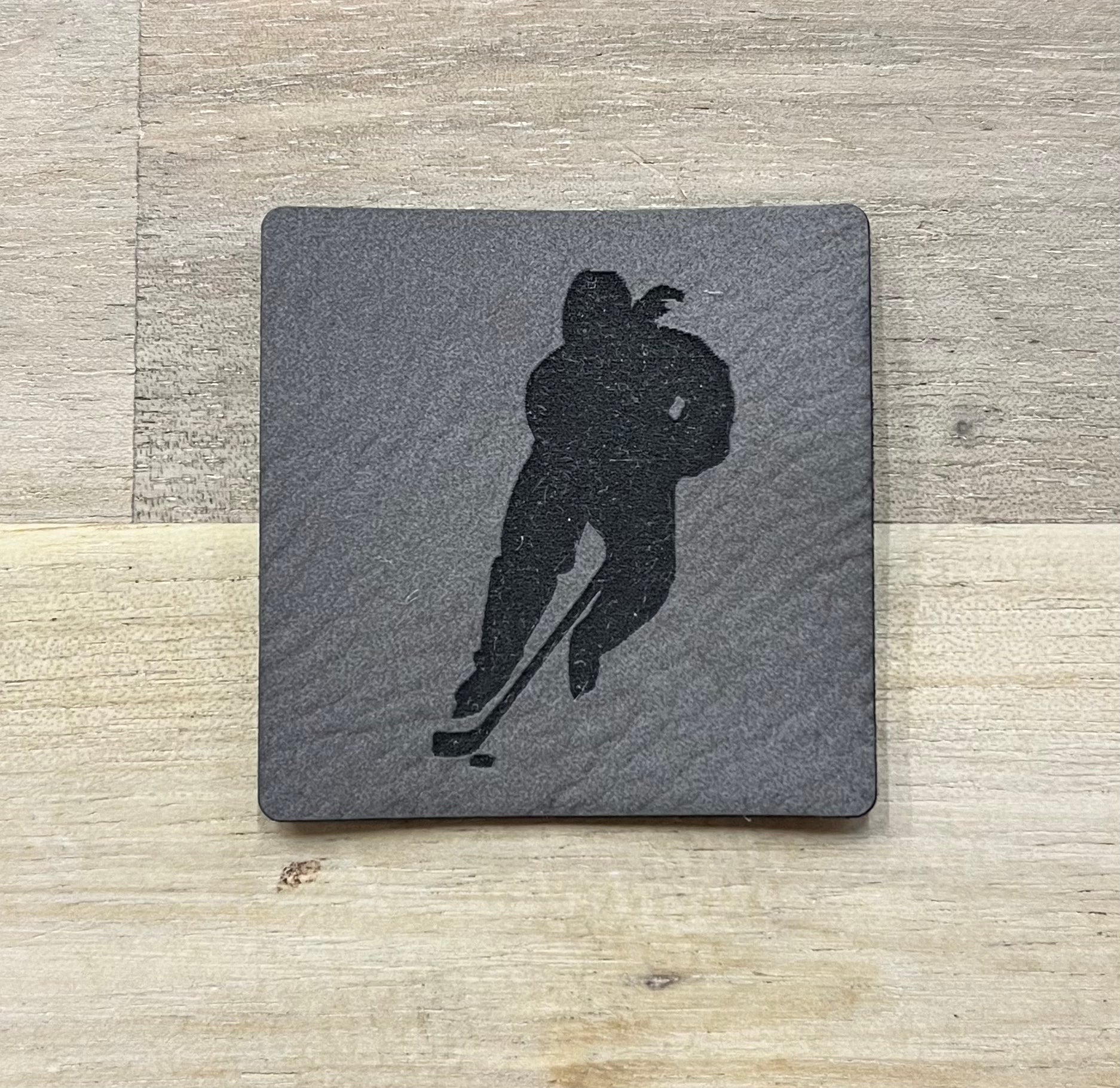 Leatherette Tag - Hockey Player with pony tail- 1.5"x1.5" - Blue/Gold