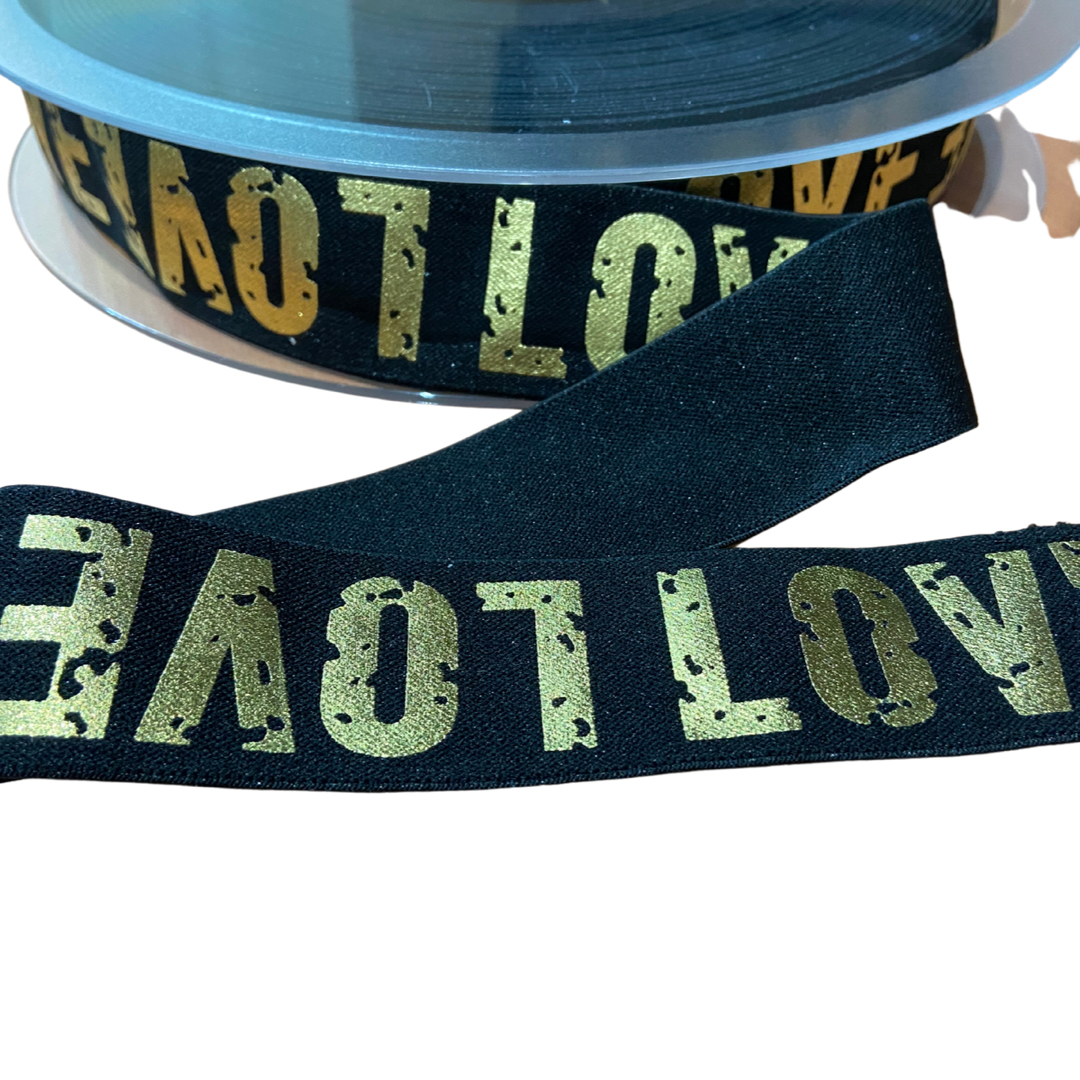 Plush Elastic - " LOVE" on Black ( Sold By the meter) - Gold