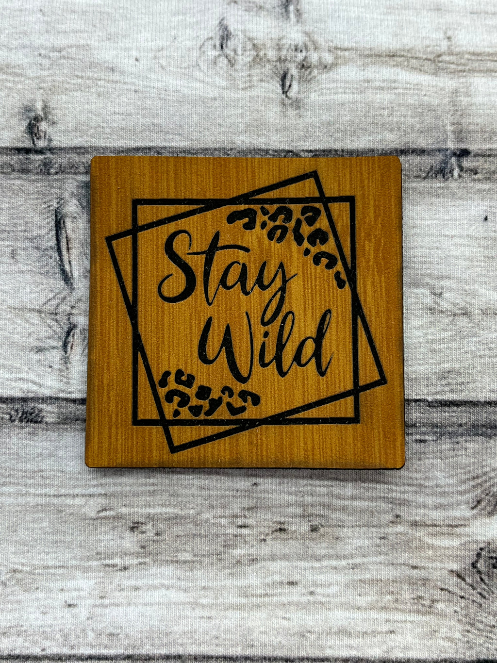 Leatherette Tags - 2 inch x 2 inch " Stay Wild" Wood Grain/Black - $1.50