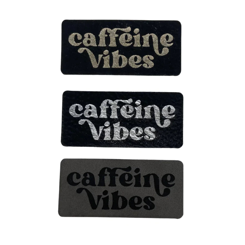 Leatherette Tags - 2 inch x .75 inch "Caffeine Vibes" - Rustic/Gold - $1.00