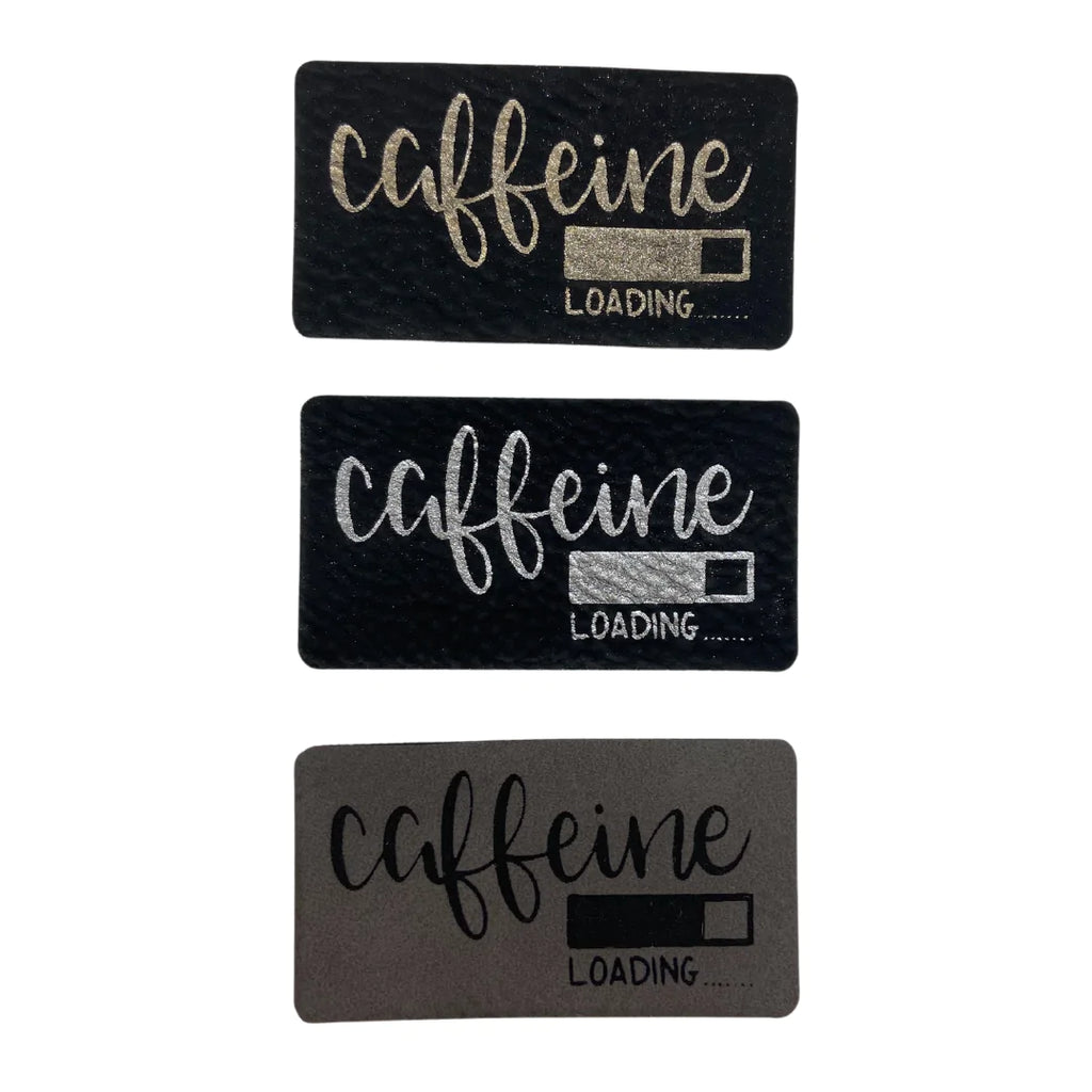 Leatherette Tags - 2 inch x 1 inch "Caffeine Loading" Black/Gold - $1.00