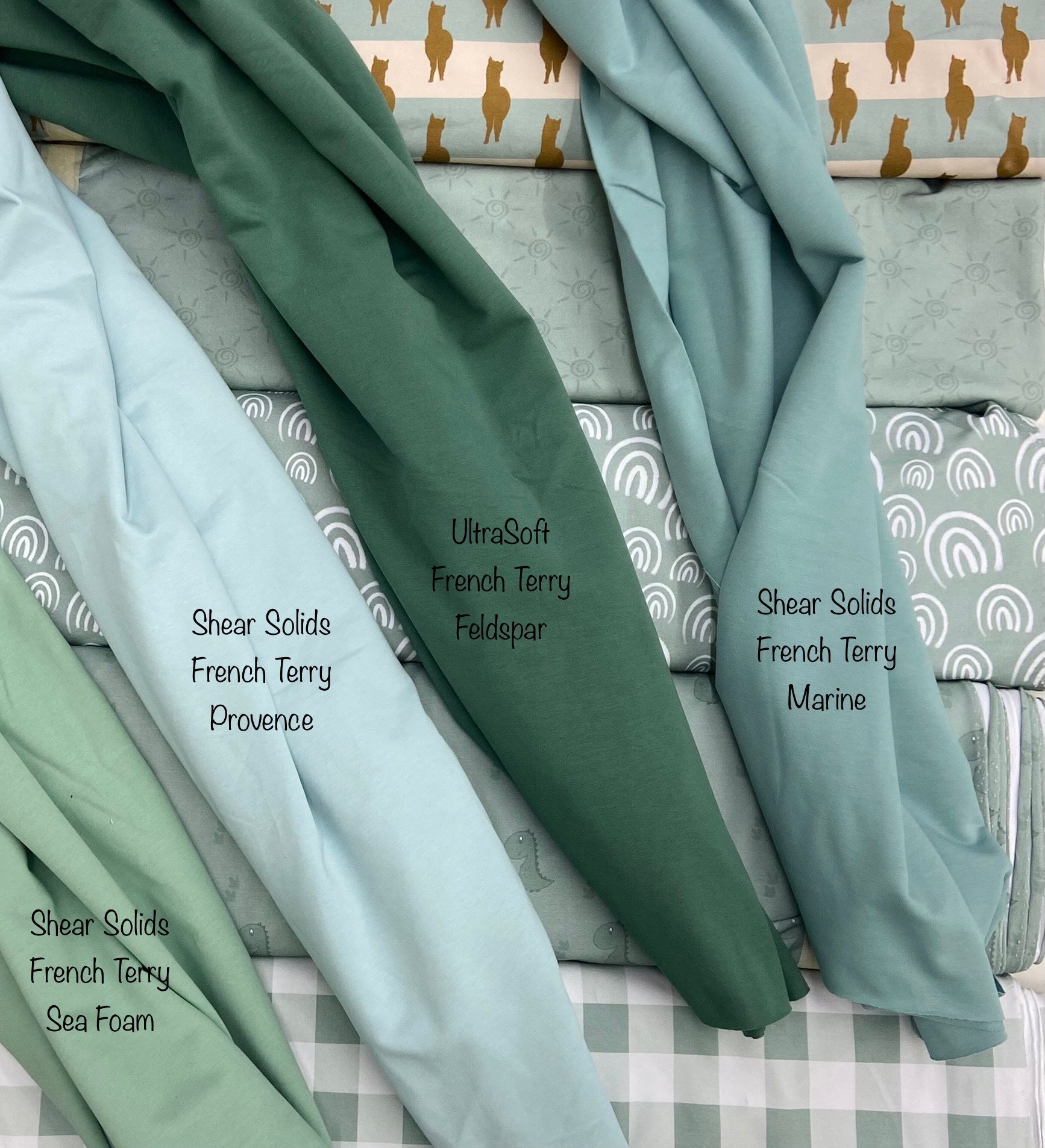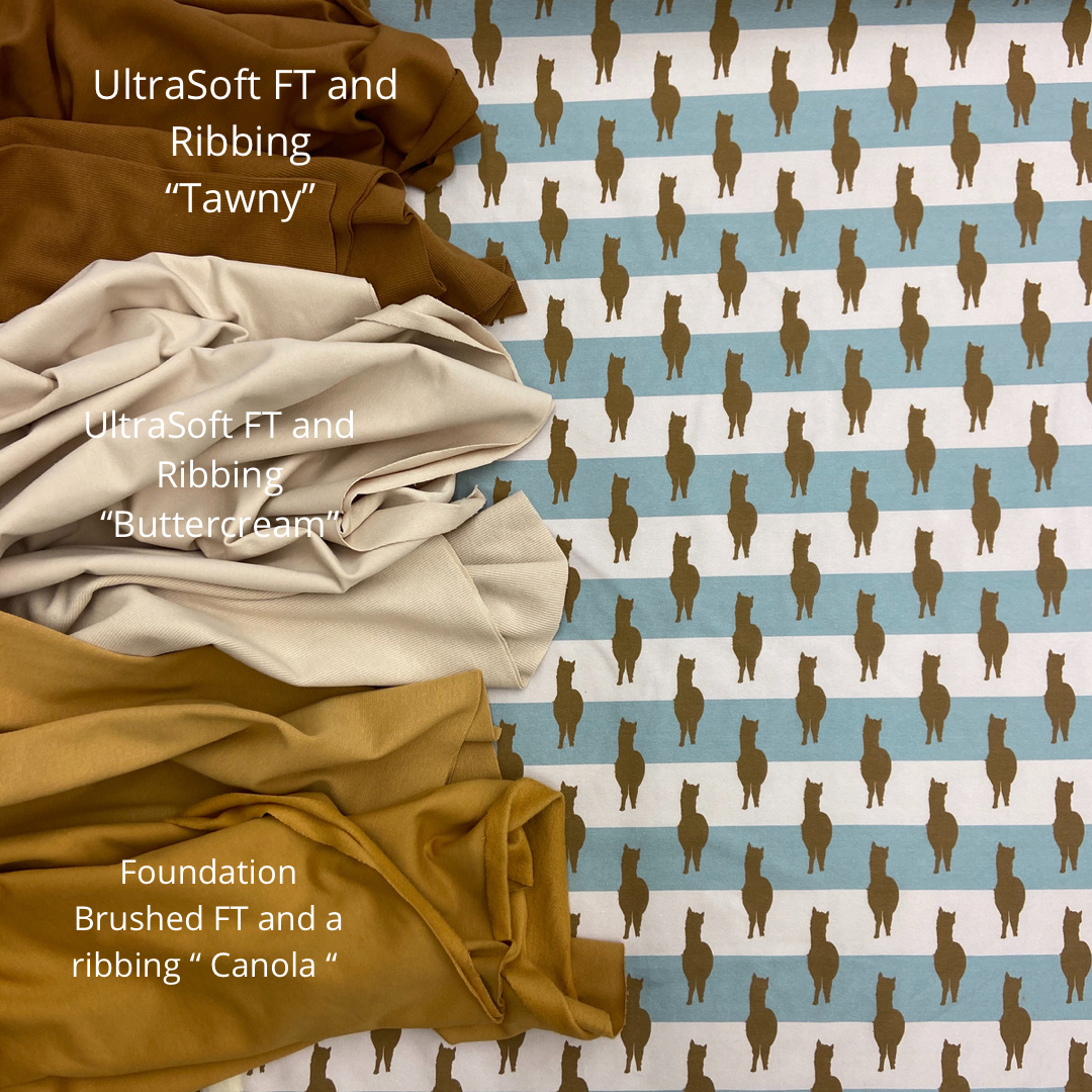 Kahki Brushed FT, Sea Foam , Provence, Feldspar, Marine, Butter Cream , Tawny , canola ( brushed FT) Ribbing - Light Kahki , buttercream , tawny , canola |