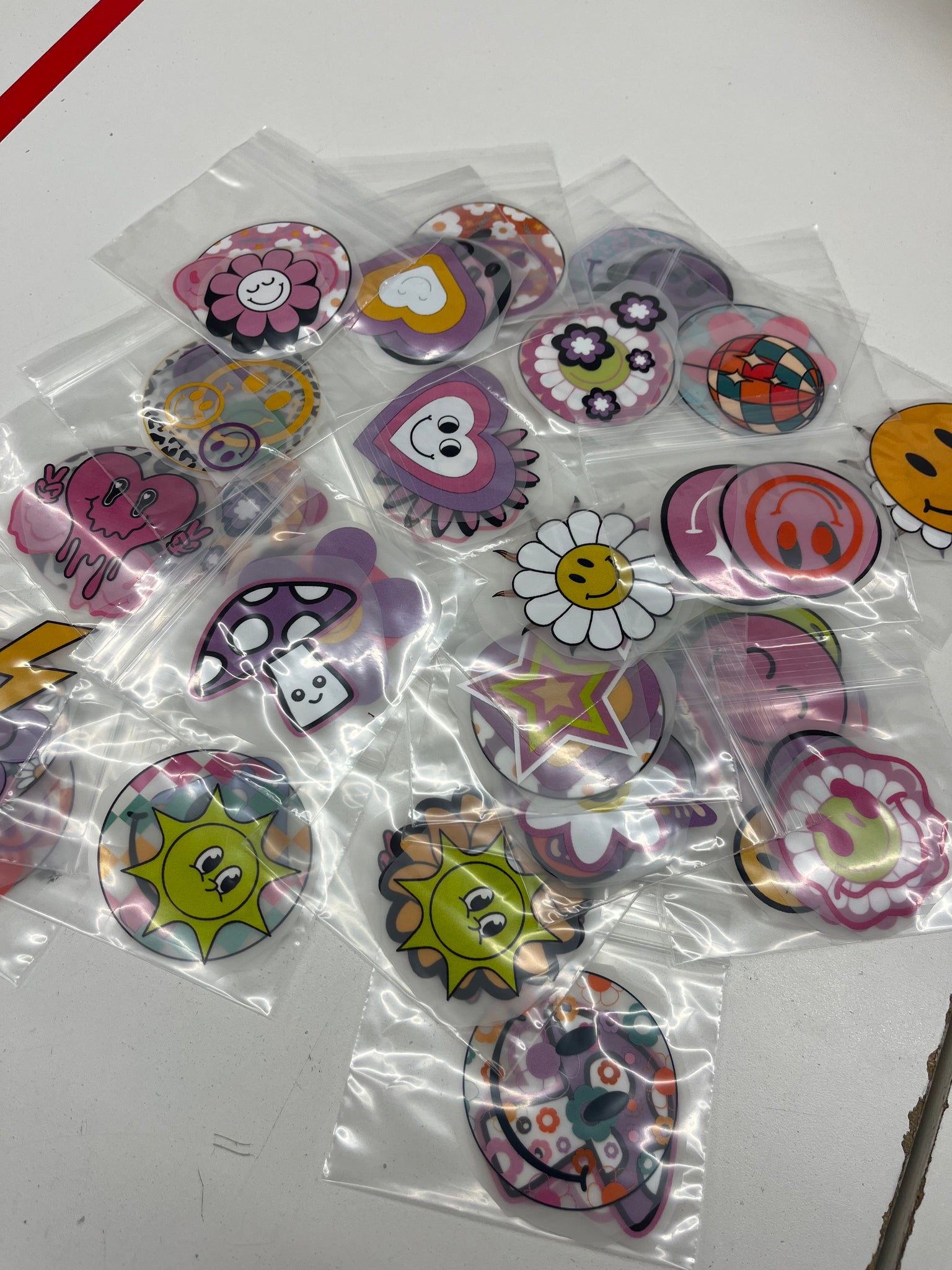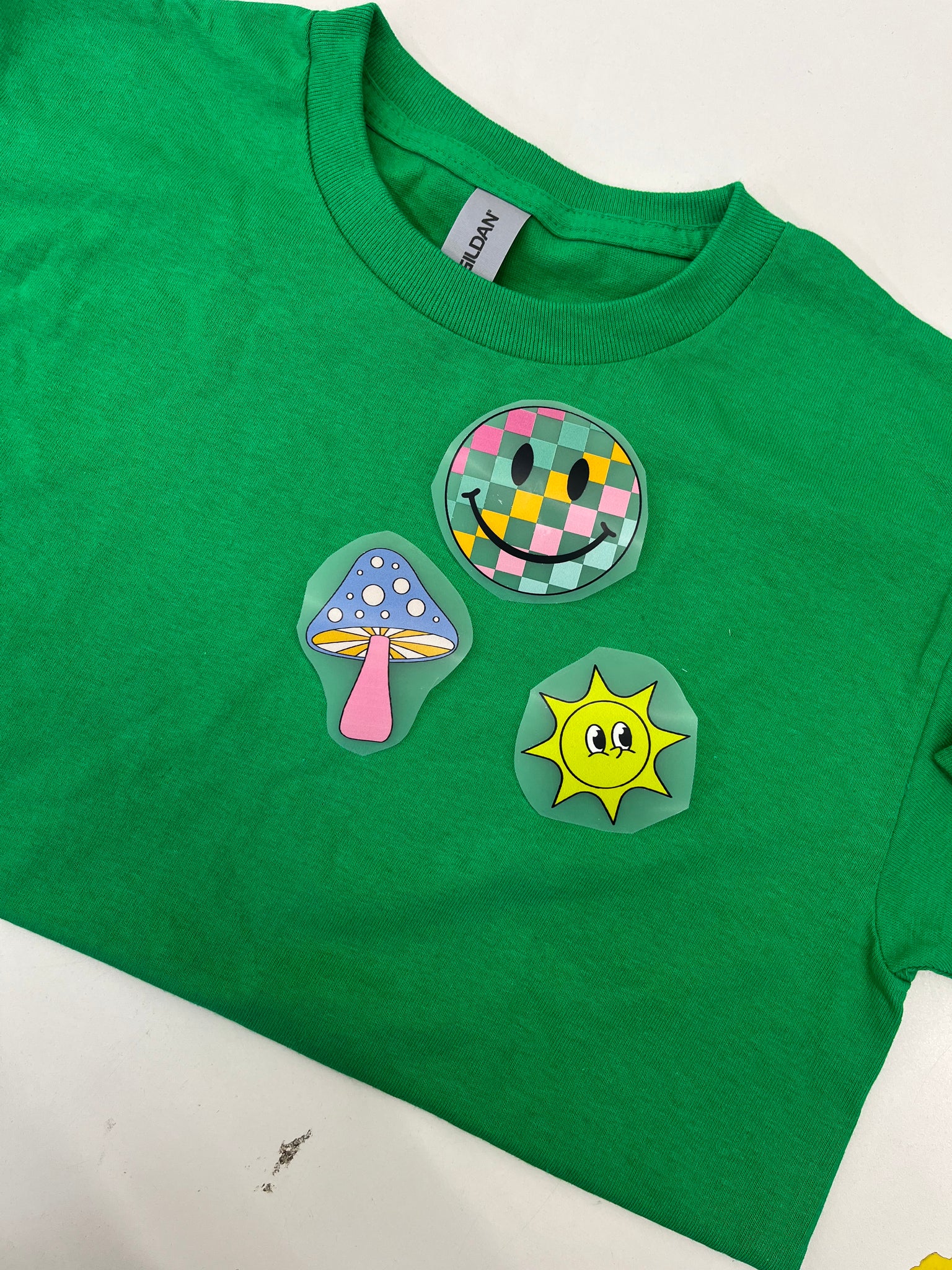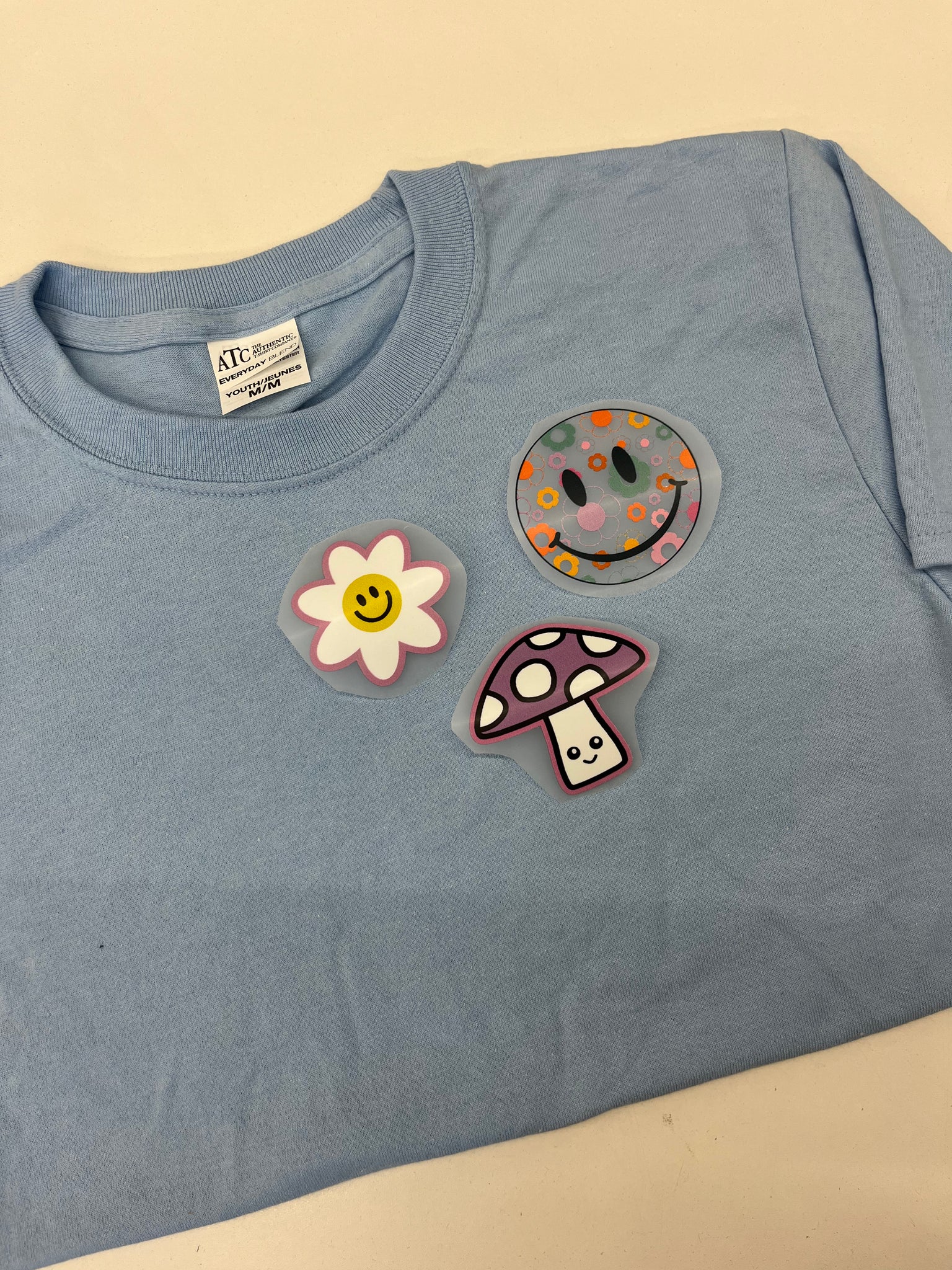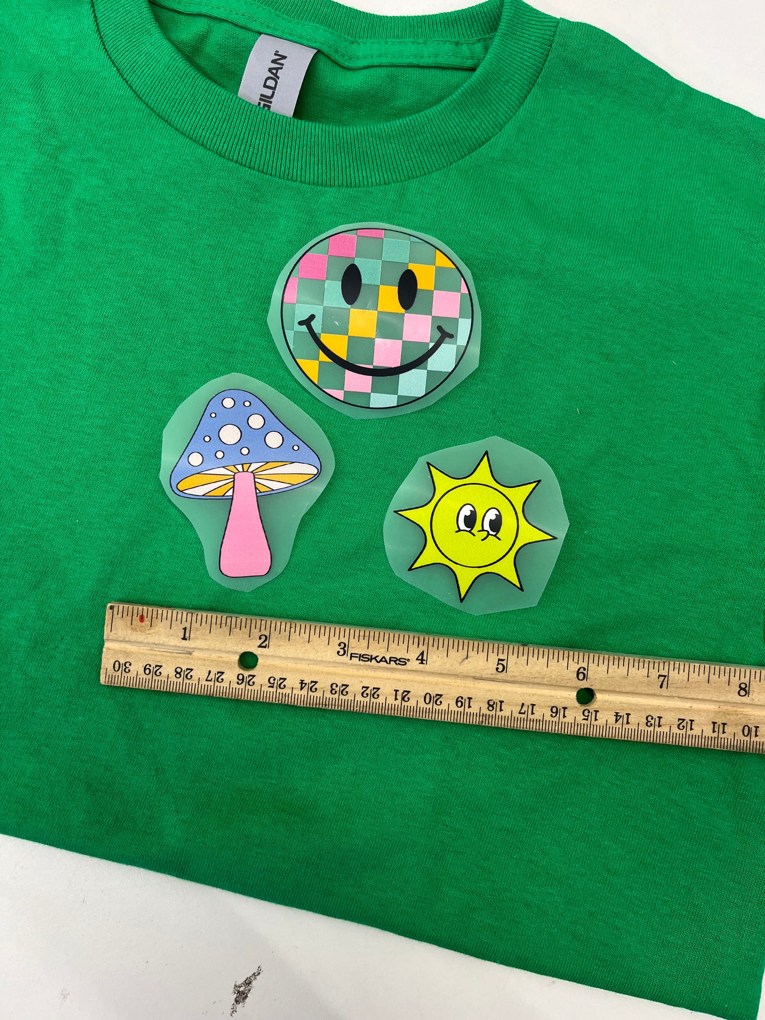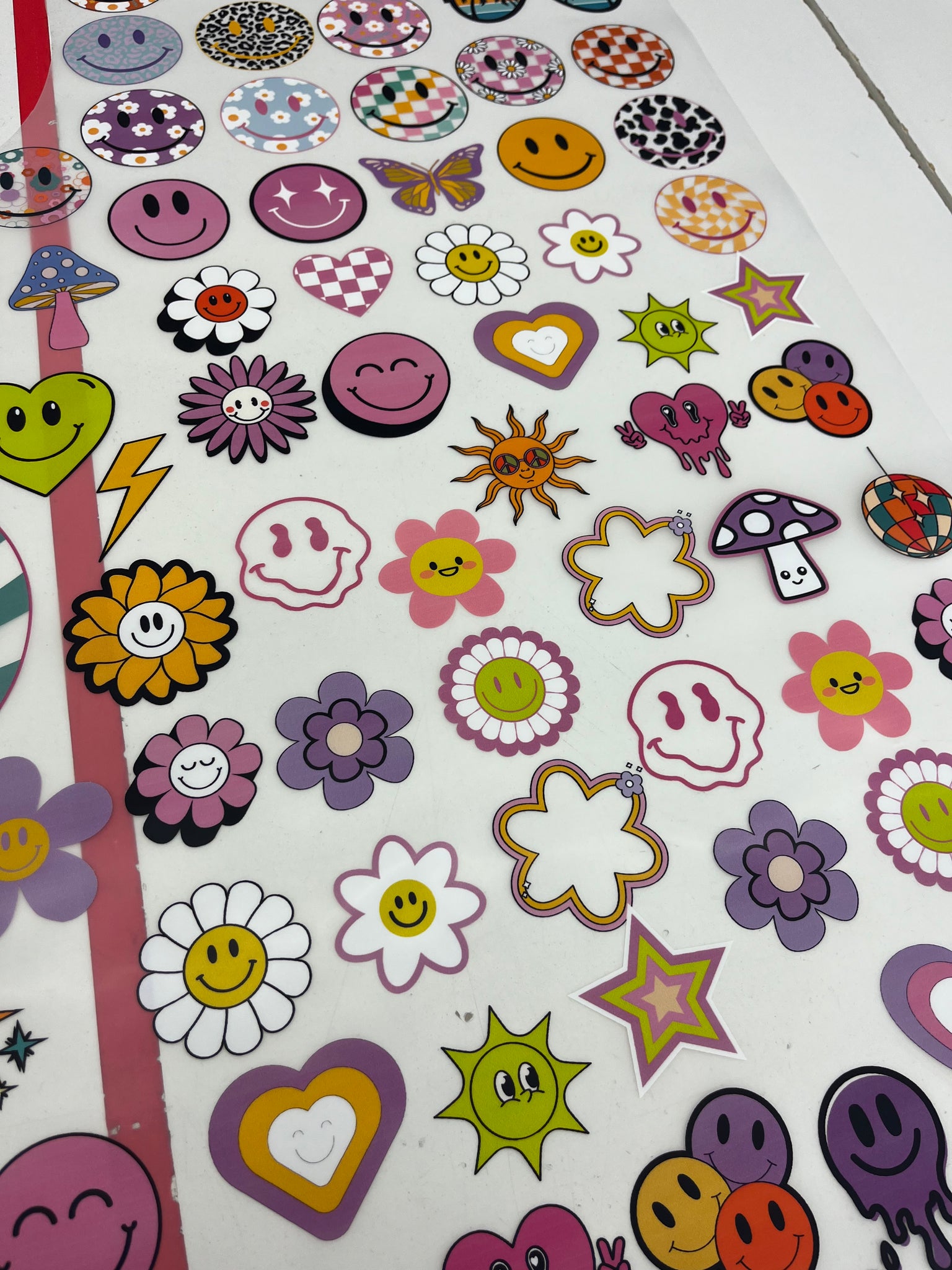 **********This pack has 3 mini, fun colored Happy themed DTF transfers. They range in sizes. 1.5-2.5. Perfect for those pockets!! They are pre made packs so the surprise inside is what you get!!!********