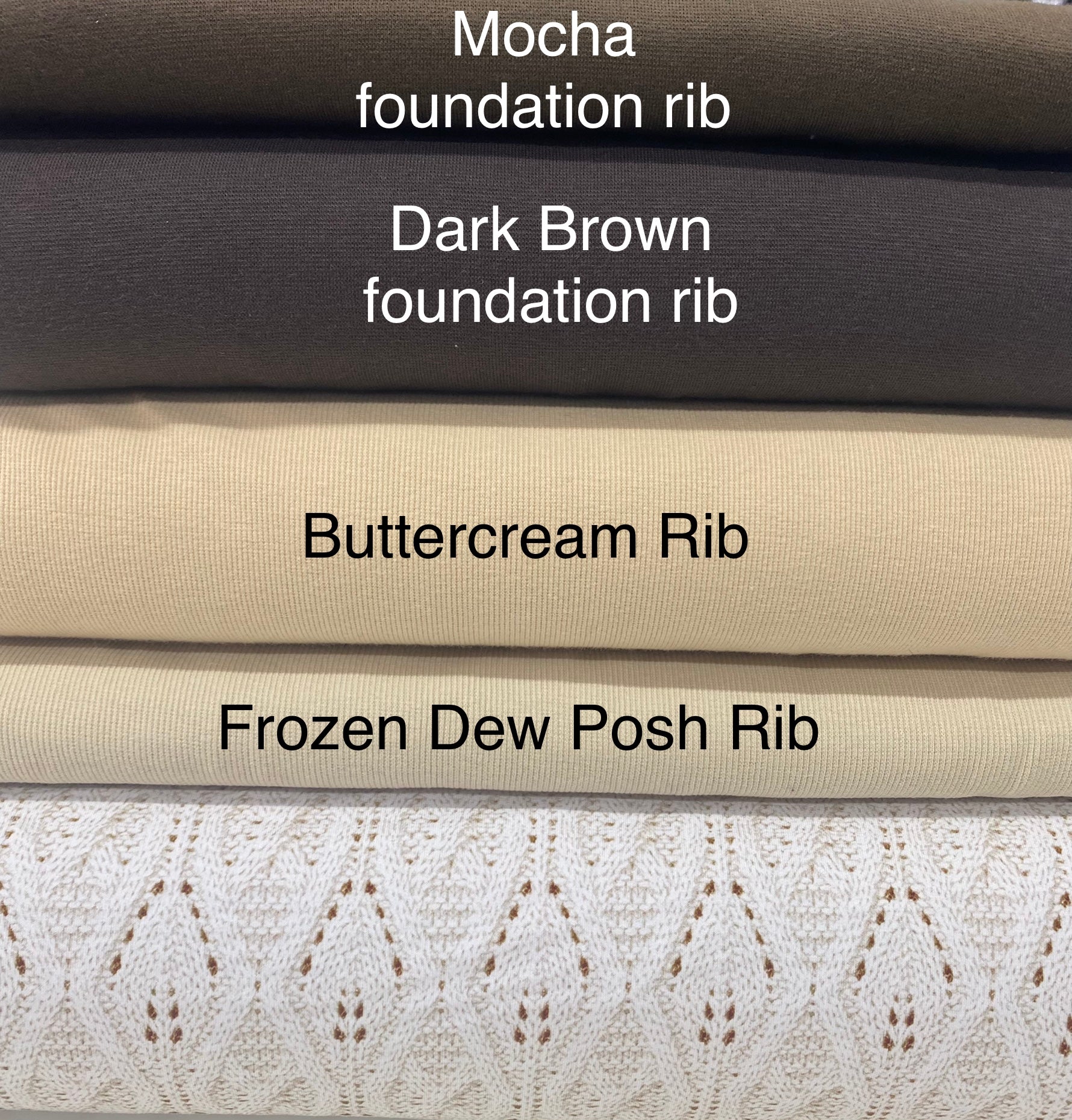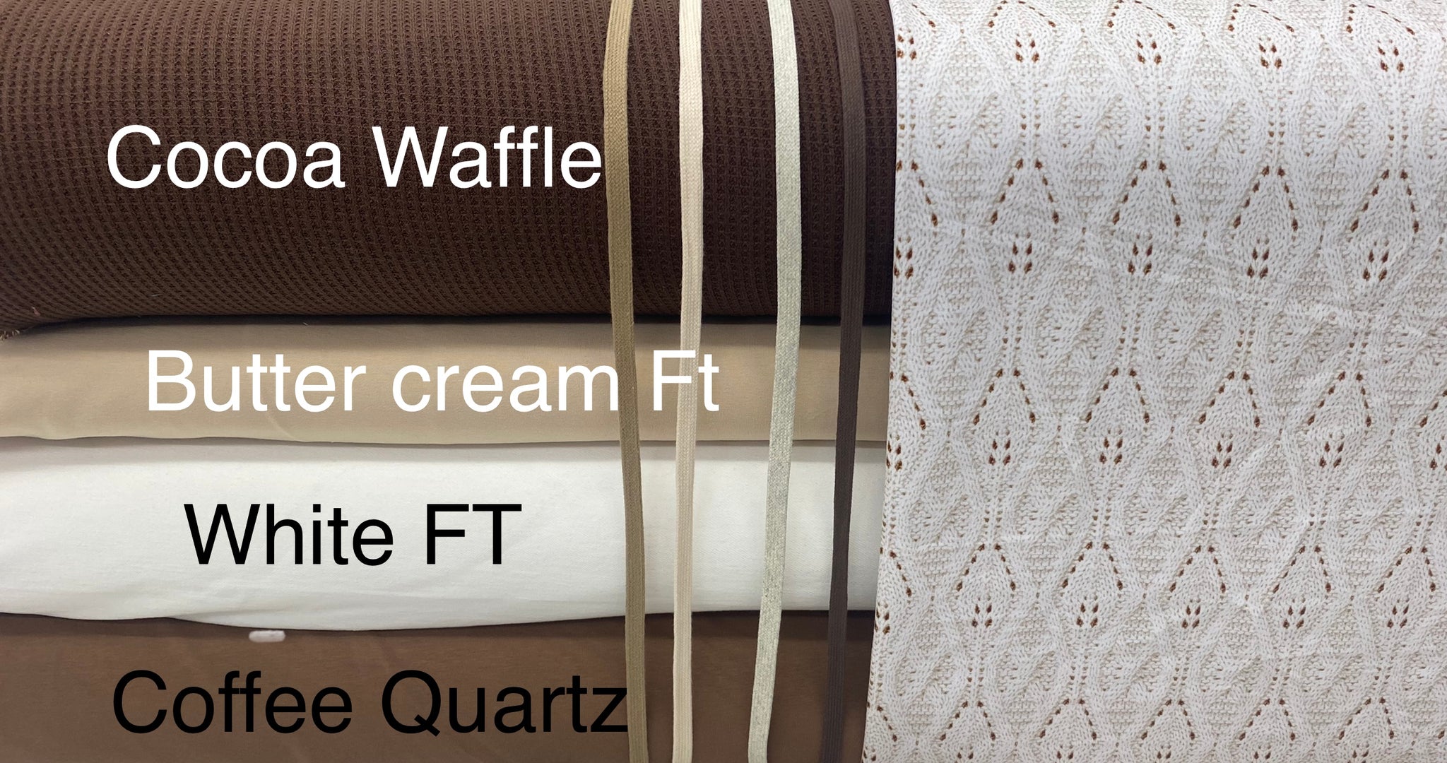Sold by: 1/2 meter Price / .5 m Composition GSM Width Stretch French Terry $14.50 95% Cotton 5% Spandex 290-300 155-160cm 4 way (40-50%) Co-ordinates Bias Tape Drawstring Oatmeal, Chocolate, Iced Coffee, Parchment Shear Solids FT or...Read more