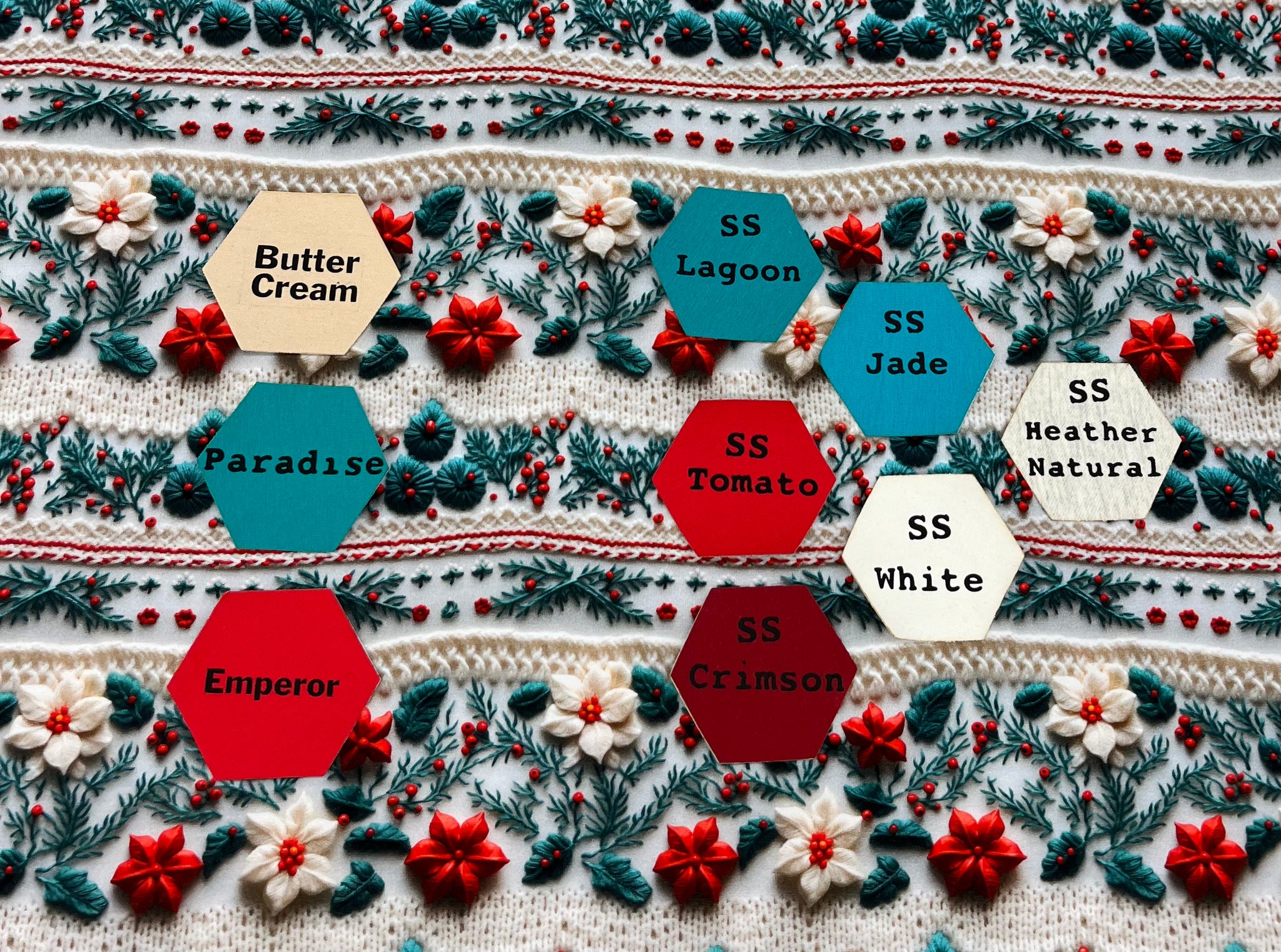 Turquoise, Blue Grass, White, Red, Dark Red, Bottle Green |